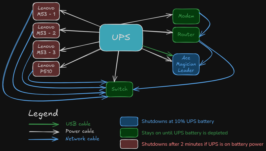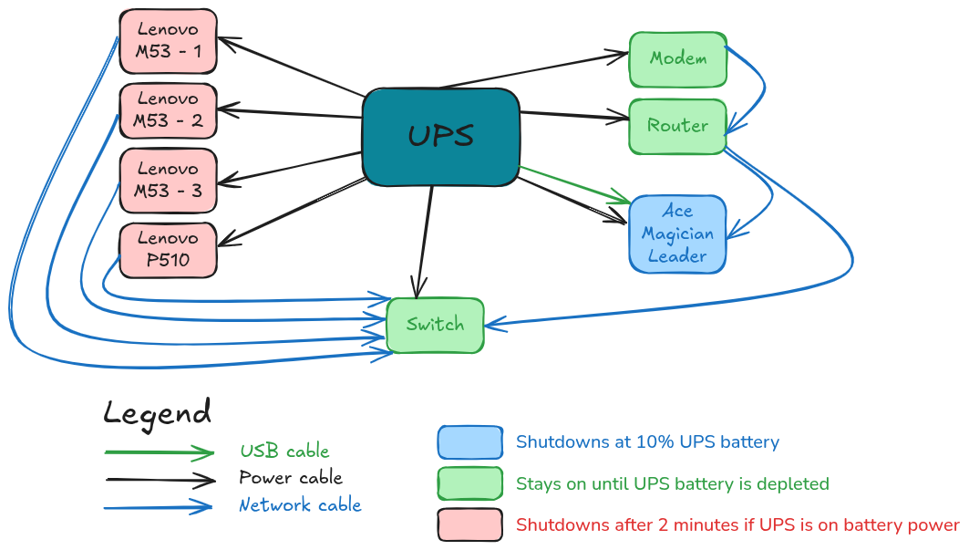 Here's a diagram on how my cluster is connected and behaves in case of a power outage.